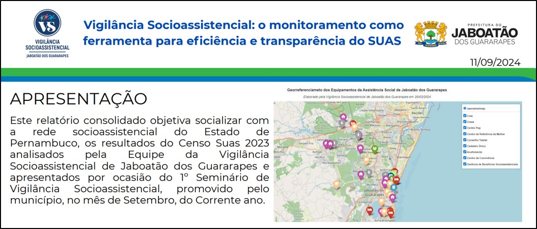 9 de outubro de 2024 Vigilância Socioassistencial: o monitoramento como ferramenta para eficiência e transparência do SUAS – Jaboatão dos Guararapes/PE PreviousNext